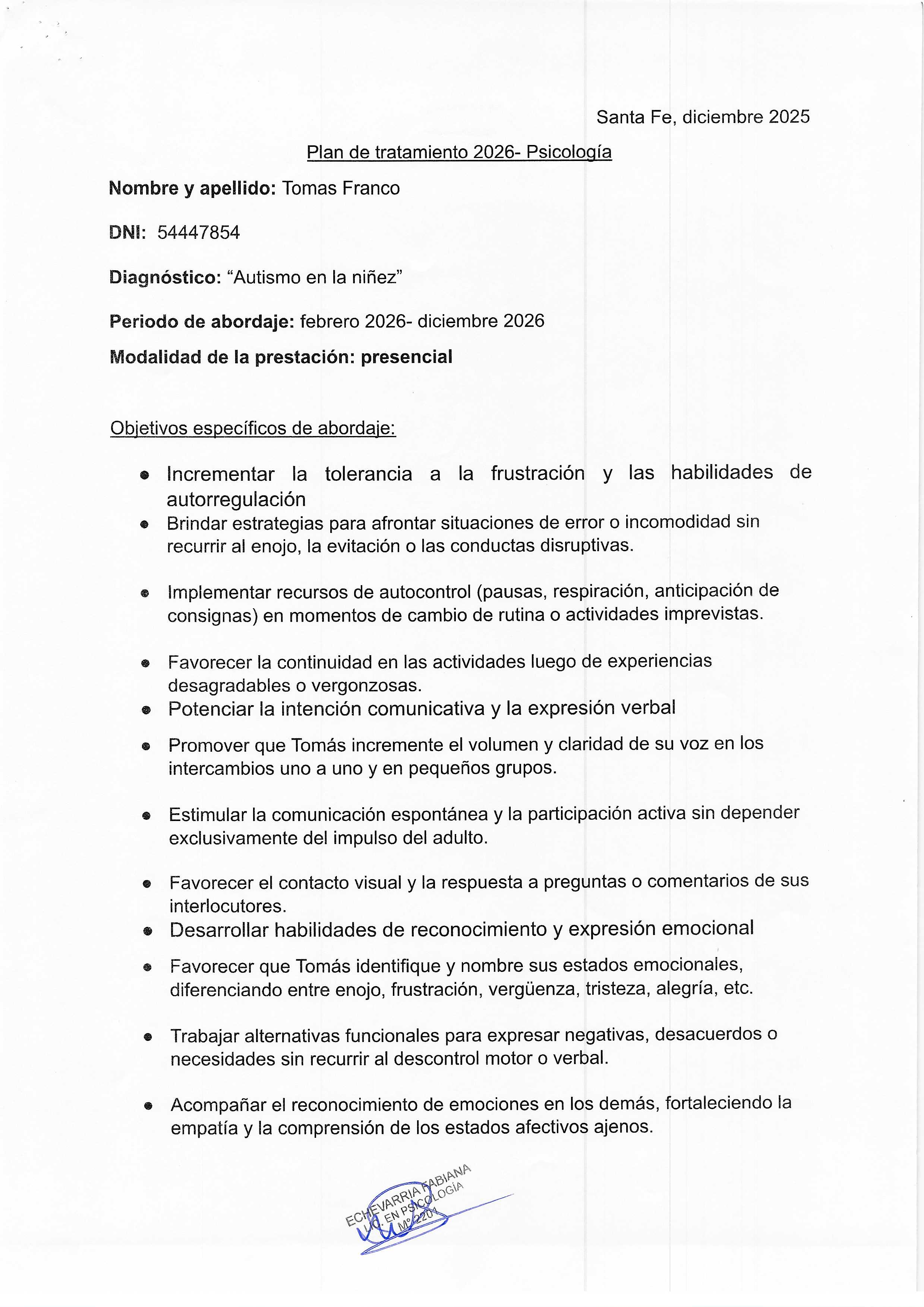 | 267 | ECHEVARRIA FABIANA | PLAN DE TRATAMIENTO |