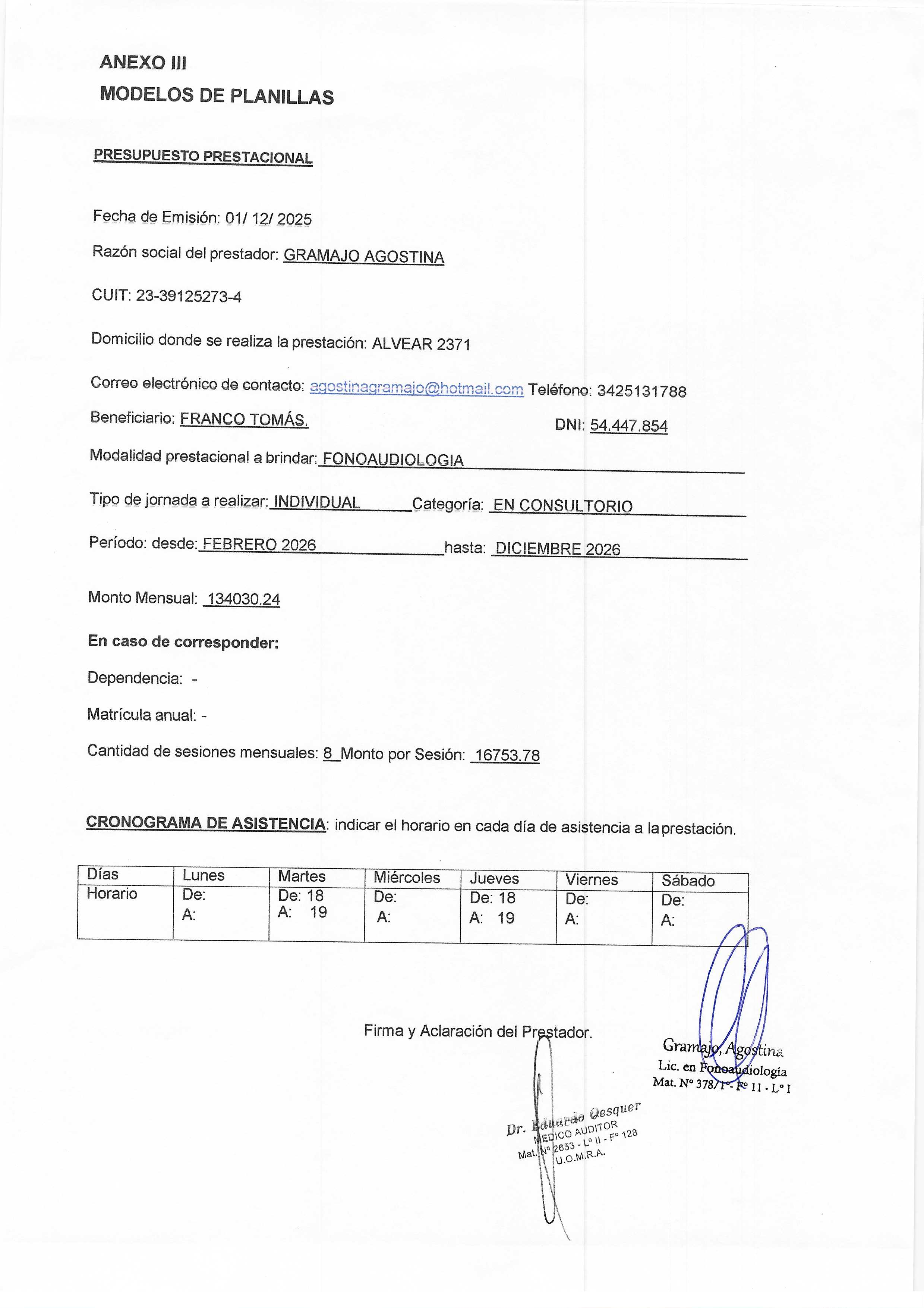 | 266 | ECHEVARRIA FABIANA | PRESUPUESTO | 12/31/2026 12:00:00 AM | Modificar Eliminar | |